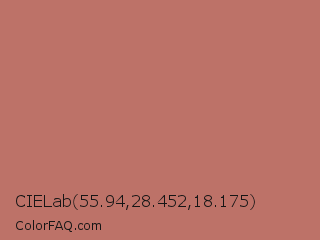 CIELab 55.94,28.452,18.175 Color is a normal red color and the nearest color is Contessa #c6726b. Hex code #bd7268 and RGB value is rgb(189,114,104). In RGB color space, this color is composed of 74% red, 45% green, 41% blue, In CMYK color space, this color is composed of 0% cyan, 40% magenta, 45% yellow , 26% black , In HSL color space, this color has a hue angle of 7° , 39% saturation and 57% lightness.