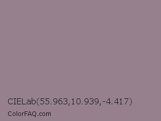 CIELab 55.963,10.939,-4.417 Color is a normal magenta color and the nearest color is Venus #928590. Hex code #96808e and RGB value is rgb(150,128,142). In RGB color space, this color is composed of 59% red, 50% green, 56% blue, In CMYK color space, this color is composed of 0% cyan, 15% magenta, 5% yellow , 41% black , In HSL color space, this color has a hue angle of 322° , 9% saturation and 55% lightness.