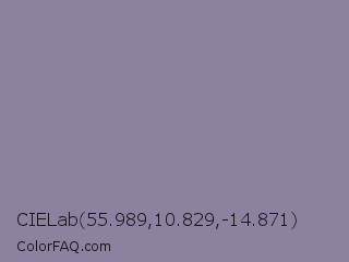 CIELab 55.989,10.829,-14.871 Color is a normal violet color and the nearest color is Manatee Crayola #8d90a1. Hex code #8d81a0 and RGB value is rgb(141,129,160). In RGB color space, this color is composed of 55% red, 51% green, 63% blue, In CMYK color space, this color is composed of 12% cyan, 19% magenta, 0% yellow , 37% black , In HSL color space, this color has a hue angle of 263° , 14% saturation and 57% lightness.
