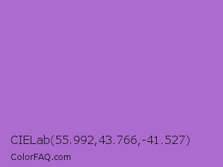 CIELab 55.992,43.766,-41.527 Color is a light purple color and the nearest color is Rich Lavender #a76bcf. Hex code #ad6bcf and RGB value is rgb(173,107,207). In RGB color space, this color is composed of 68% red, 42% green, 81% blue, In CMYK color space, this color is composed of 16% cyan, 48% magenta, 0% yellow , 19% black , In HSL color space, this color has a hue angle of 280° , 51% saturation and 62% lightness.