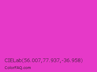 CIELab 56.007,77.937,-36.958 Color is a normal magenta color and the nearest color is Razzle Dazzle Rose #ff33cc. Hex code #e639c8 and RGB value is rgb(230,57,200). In RGB color space, this color is composed of 90% red, 22% green, 78% blue, In CMYK color space, this color is composed of 0% cyan, 75% magenta, 13% yellow , 10% black , In HSL color space, this color has a hue angle of 310° , 78% saturation and 56% lightness.