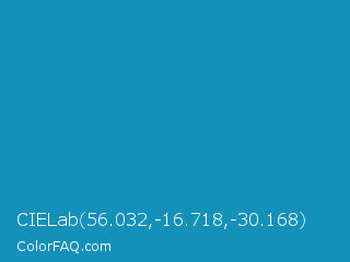 CIELab 56.032,-16.718,-30.168 Color is a normal blue color and the nearest color is Blue Green #0d98ba. Hex code #1491ba and RGB value is rgb(20,145,186). In RGB color space, this color is composed of 8% red, 57% green, 73% blue, In CMYK color space, this color is composed of 89% cyan, 22% magenta, 0% yellow , 27% black , In HSL color space, this color has a hue angle of 195° , 81% saturation and 40% lightness.