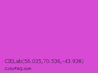 CIELab 56.035,70.536,-43.938 Color is a normal magenta color and the nearest color is Steel Pink #cc33cc. Hex code #d64ad4 and RGB value is rgb(214,74,212). In RGB color space, this color is composed of 84% red, 29% green, 83% blue, In CMYK color space, this color is composed of 0% cyan, 65% magenta, 1% yellow , 16% black , In HSL color space, this color has a hue angle of 301° , 63% saturation and 56% lightness.