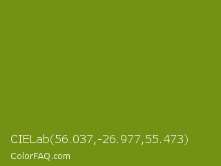 CIELab 56.037,-26.977,55.473 Color is a normal lime color and the nearest color is Trendy Green #7c881a. Hex code #739115 and RGB value is rgb(115,145,21). In RGB color space, this color is composed of 45% red, 57% green, 8% blue, In CMYK color space, this color is composed of 21% cyan, 0% magenta, 86% yellow , 43% black , In HSL color space, this color has a hue angle of 75° , 75% saturation and 33% lightness.
