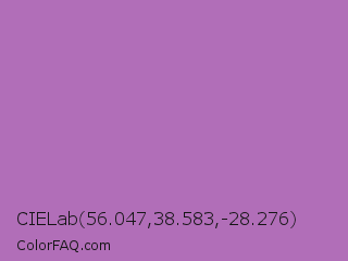 CIELab 56.047,38.583,-28.276 Color is a normal magenta color and the nearest color is African Violet #b284be. Hex code #b16eb8 and RGB value is rgb(177,110,184). In RGB color space, this color is composed of 69% red, 43% green, 72% blue, In CMYK color space, this color is composed of 4% cyan, 40% magenta, 0% yellow , 28% black , In HSL color space, this color has a hue angle of 294° , 34% saturation and 58% lightness.