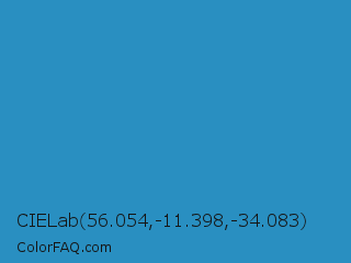 CIELab 56.054,-11.398,-34.083 Color is a normal blue color and the nearest color is Cyan Cornflower Blue #188bc2. Hex code #298fc1 and RGB value is rgb(41,143,193). In RGB color space, this color is composed of 16% red, 56% green, 76% blue, In CMYK color space, this color is composed of 79% cyan, 26% magenta, 0% yellow , 24% black , In HSL color space, this color has a hue angle of 200° , 65% saturation and 46% lightness.