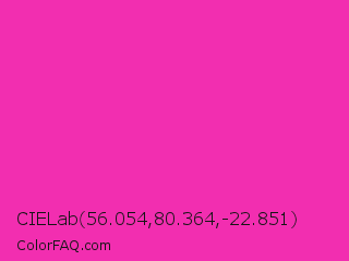 CIELab 56.054,80.364,-22.851 Color is a normal magenta color and the nearest color is Frostbite #e936a7. Hex code #f22eb0 and RGB value is rgb(242,46,176). In RGB color space, this color is composed of 95% red, 18% green, 69% blue, In CMYK color space, this color is composed of 0% cyan, 81% magenta, 27% yellow , 5% black , In HSL color space, this color has a hue angle of 320° , 88% saturation and 56% lightness.