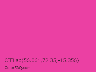 CIELab 56.061,72.35,-15.356 Color is a normal magenta color and the nearest color is Frostbite #e936a7. Hex code #eb40a3 and RGB value is rgb(235,64,163). In RGB color space, this color is composed of 92% red, 25% green, 64% blue, In CMYK color space, this color is composed of 0% cyan, 73% magenta, 31% yellow , 8% black , In HSL color space, this color has a hue angle of 325° , 81% saturation and 59% lightness.