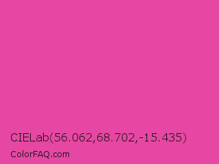 CIELab 56.062,68.702,-15.435 Color is a normal magenta color and the nearest color is Raspberry Pink #e25098. Hex code #e647a3 and RGB value is rgb(230,71,163). In RGB color space, this color is composed of 90% red, 28% green, 64% blue, In CMYK color space, this color is composed of 0% cyan, 69% magenta, 29% yellow , 10% black , In HSL color space, this color has a hue angle of 325° , 76% saturation and 59% lightness.