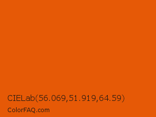 CIELab 56.069,51.919,64.59 Color is a normal orange color and the nearest color is Persimmon #ec5800. Hex code #e65906 and RGB value is rgb(230,89,6). In RGB color space, this color is composed of 90% red, 35% green, 2% blue, In CMYK color space, this color is composed of 0% cyan, 61% magenta, 97% yellow , 10% black , In HSL color space, this color has a hue angle of 22° , 95% saturation and 46% lightness.