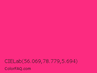 CIELab 56.069,78.779,5.694 Color is a normal rose color and the nearest color is Cerise Pink #ec3b83. Hex code #fc2b80 and RGB value is rgb(252,43,128). In RGB color space, this color is composed of 99% red, 17% green, 50% blue, In CMYK color space, this color is composed of 0% cyan, 83% magenta, 49% yellow , 1% black , In HSL color space, this color has a hue angle of 336° , 97% saturation and 58% lightness.