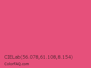 CIELab 56.078,61.108,8.154 Color is a light rose color and the nearest color is Dark Pink #e75480. Hex code #e6507b and RGB value is rgb(230,80,123). In RGB color space, this color is composed of 90% red, 31% green, 48% blue, In CMYK color space, this color is composed of 0% cyan, 65% magenta, 47% yellow , 10% black , In HSL color space, this color has a hue angle of 343° , 75% saturation and 61% lightness.