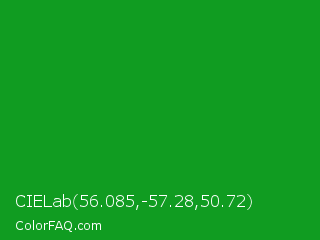 CIELab 56.085,-57.28,50.72 Color is a normal green color and the nearest color is North Texas Green #059033. Hex code #109c21 and RGB value is rgb(16,156,33). In RGB color space, this color is composed of 6% red, 61% green, 13% blue, In CMYK color space, this color is composed of 90% cyan, 0% magenta, 79% yellow , 39% black , In HSL color space, this color has a hue angle of 127° , 81% saturation and 34% lightness.