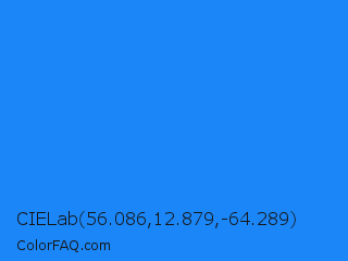 CIELab 56.086,12.879,-64.289 Color is a normal blue color and the nearest color is Dodger Blue #1e90ff. Hex code #1b86f7 and RGB value is rgb(27,134,247). In RGB color space, this color is composed of 11% red, 53% green, 97% blue, In CMYK color space, this color is composed of 89% cyan, 46% magenta, 0% yellow , 3% black , In HSL color space, this color has a hue angle of 211° , 93% saturation and 54% lightness.