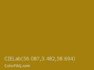 CIELab 56.087,3.482,58.694 Color is a normal yellow color and the nearest color is Dark Yellow #9b870c. Hex code #a5820f and RGB value is rgb(165,130,15). In RGB color space, this color is composed of 65% red, 51% green, 6% blue, In CMYK color space, this color is composed of 0% cyan, 21% magenta, 91% yellow , 35% black , In HSL color space, this color has a hue angle of 46° , 83% saturation and 35% lightness.