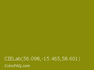 CIELab 56.098,-15.465,58.601 Color is a dark yellow color and the nearest color is Olive #808000. Hex code #888c09 and RGB value is rgb(136,140,9). In RGB color space, this color is composed of 53% red, 55% green, 4% blue, In CMYK color space, this color is composed of 3% cyan, 0% magenta, 94% yellow , 45% black , In HSL color space, this color has a hue angle of 62° , 88% saturation and 29% lightness.