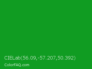 CIELab 56.09,-57.207,50.392 Color is a normal green color and the nearest color is North Texas Green #059033. Hex code #109c22 and RGB value is rgb(16,156,34). In RGB color space, this color is composed of 6% red, 61% green, 13% blue, In CMYK color space, this color is composed of 90% cyan, 0% magenta, 78% yellow , 39% black , In HSL color space, this color has a hue angle of 128° , 81% saturation and 34% lightness.