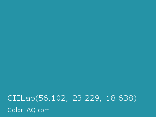 CIELab 56.102,-23.229,-18.638 Color is a normal cyan color and the nearest color is Eastern Blue #1e9ab0. Hex code #2593a6 and RGB value is rgb(37,147,166). In RGB color space, this color is composed of 15% red, 58% green, 65% blue, In CMYK color space, this color is composed of 78% cyan, 11% magenta, 0% yellow , 35% black , In HSL color space, this color has a hue angle of 189° , 64% saturation and 40% lightness.