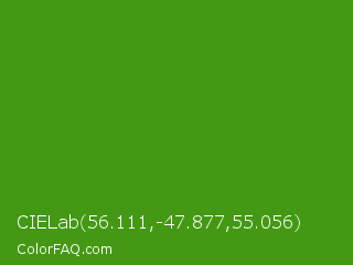CIELab 56.111,-47.877,55.056 Color is a normal green color and the nearest color is Vida Loca #549019. Hex code #439913 and RGB value is rgb(67,153,19). In RGB color space, this color is composed of 26% red, 60% green, 7% blue, In CMYK color space, this color is composed of 56% cyan, 0% magenta, 88% yellow , 40% black , In HSL color space, this color has a hue angle of 99° , 78% saturation and 34% lightness.