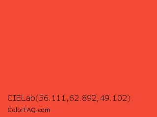 CIELab 56.111,62.892,49.102 Color is a normal red color and the nearest color is Flamingo #f2552a. Hex code #f24a34 and RGB value is rgb(242,74,52). In RGB color space, this color is composed of 95% red, 29% green, 20% blue, In CMYK color space, this color is composed of 0% cyan, 69% magenta, 79% yellow , 5% black , In HSL color space, this color has a hue angle of 7° , 88% saturation and 58% lightness.