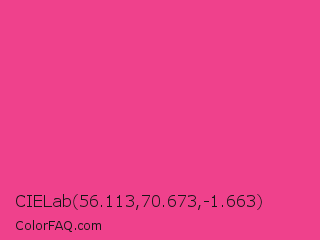 CIELab 56.113,70.673,-1.663 Color is a normal rose color and the nearest color is Violet Red #f7468a. Hex code #ef418c and RGB value is rgb(239,65,140). In RGB color space, this color is composed of 94% red, 25% green, 55% blue, In CMYK color space, this color is composed of 0% cyan, 73% magenta, 41% yellow , 6% black , In HSL color space, this color has a hue angle of 334° , 84% saturation and 60% lightness.