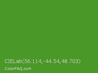 CIELab 56.114,-44.54,48.703 Color is a normal green color and the nearest color is Vida Loca #549019. Hex code #499828 and RGB value is rgb(73,152,40). In RGB color space, this color is composed of 29% red, 60% green, 16% blue, In CMYK color space, this color is composed of 52% cyan, 0% magenta, 74% yellow , 40% black , In HSL color space, this color has a hue angle of 102° , 58% saturation and 38% lightness.