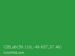 CIELab 56.116,-49.657,37.46 Color is a normal green color and the nearest color is Sea Green #2e8b57. Hex code #2c9a41 and RGB value is rgb(44,154,65). In RGB color space, this color is composed of 17% red, 60% green, 25% blue, In CMYK color space, this color is composed of 71% cyan, 0% magenta, 58% yellow , 40% black , In HSL color space, this color has a hue angle of 131° , 56% saturation and 39% lightness.