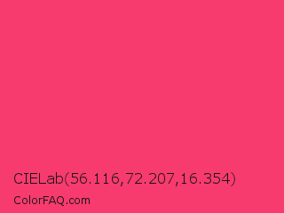 CIELab 56.116,72.207,16.354 Color is a normal rose color and the nearest color is Neon Fuchsia #fe4164. Hex code #f73b6e and RGB value is rgb(247,59,110). In RGB color space, this color is composed of 97% red, 23% green, 43% blue, In CMYK color space, this color is composed of 0% cyan, 76% magenta, 55% yellow , 3% black , In HSL color space, this color has a hue angle of 344° , 92% saturation and 60% lightness.