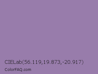 CIELab 56.119,19.873,-20.917 Color is a normal purple color and the nearest color is Lavender Purple #967bb6. Hex code #987cab and RGB value is rgb(152,124,171). In RGB color space, this color is composed of 60% red, 49% green, 67% blue, In CMYK color space, this color is composed of 11% cyan, 27% magenta, 0% yellow , 33% black , In HSL color space, this color has a hue angle of 276° , 22% saturation and 58% lightness.