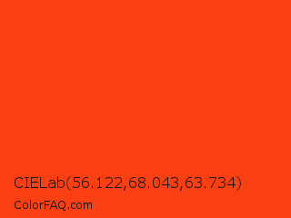 CIELab 56.122,68.043,63.734 Color is a normal red color and the nearest color is Orioles Orange #fb4f14. Hex code #fa4012 and RGB value is rgb(250,64,18). In RGB color space, this color is composed of 98% red, 25% green, 7% blue, In CMYK color space, this color is composed of 0% cyan, 74% magenta, 93% yellow , 2% black , In HSL color space, this color has a hue angle of 12° , 96% saturation and 53% lightness.