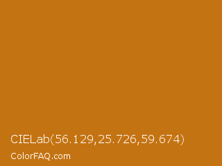 CIELab 56.129,25.726,59.674 Color is a normal orange color and the nearest color is Meteor #d07d12. Hex code #c47312 and RGB value is rgb(196,115,18). In RGB color space, this color is composed of 77% red, 45% green, 7% blue, In CMYK color space, this color is composed of 0% cyan, 41% magenta, 91% yellow , 23% black , In HSL color space, this color has a hue angle of 33° , 83% saturation and 42% lightness.