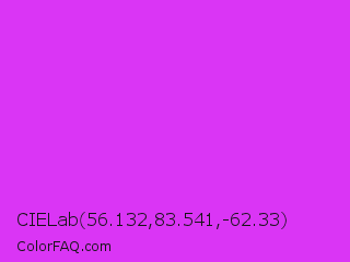 CIELab 56.132,83.541,-62.33 Color is a normal magenta color and the nearest color is Steel Pink #cc33cc. Hex code #da35f5 and RGB value is rgb(218,53,245). In RGB color space, this color is composed of 85% red, 21% green, 96% blue, In CMYK color space, this color is composed of 11% cyan, 78% magenta, 0% yellow , 4% black , In HSL color space, this color has a hue angle of 292° , 91% saturation and 58% lightness.