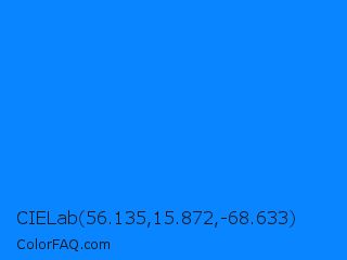 CIELab 56.135,15.872,-68.633 Color is a normal blue color and the nearest color is Azure Radiance #007fff. Hex code #0885ff and RGB value is rgb(8,133,255). In RGB color space, this color is composed of 3% red, 52% green, 100% blue, In CMYK color space, this color is composed of 97% cyan, 48% magenta, 0% yellow , 0% black , In HSL color space, this color has a hue angle of 210° , 100% saturation and 52% lightness.