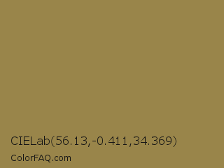 CIELab 56.13,-0.411,34.369 Color is a normal orange color and the nearest color is Dark Tan #918151. Hex code #99854a and RGB value is rgb(153,133,74). In RGB color space, this color is composed of 60% red, 52% green, 29% blue, In CMYK color space, this color is composed of 0% cyan, 13% magenta, 52% yellow , 40% black , In HSL color space, this color has a hue angle of 45° , 35% saturation and 45% lightness.