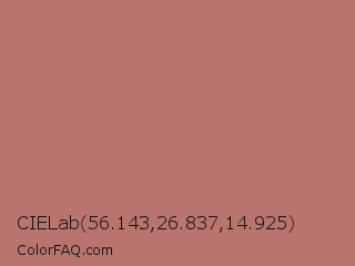 CIELab 56.143,26.837,14.925 Color is a normal red color and the nearest color is Contessa #c6726b. Hex code #ba746e and RGB value is rgb(186,116,110). In RGB color space, this color is composed of 73% red, 45% green, 43% blue, In CMYK color space, this color is composed of 0% cyan, 38% magenta, 41% yellow , 27% black , In HSL color space, this color has a hue angle of 5° , 36% saturation and 58% lightness.