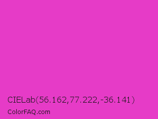 CIELab 56.162,77.222,-36.141 Color is a normal magenta color and the nearest color is Razzle Dazzle Rose #ff33cc. Hex code #e63bc7 and RGB value is rgb(230,59,199). In RGB color space, this color is composed of 90% red, 23% green, 78% blue, In CMYK color space, this color is composed of 0% cyan, 74% magenta, 13% yellow , 10% black , In HSL color space, this color has a hue angle of 311° , 77% saturation and 57% lightness.
