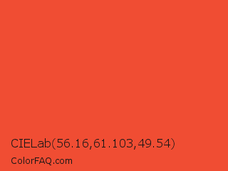 CIELab 56.16,61.103,49.54 Color is a normal red color and the nearest color is Flamingo #f2552a. Hex code #f04d33 and RGB value is rgb(240,77,51). In RGB color space, this color is composed of 94% red, 30% green, 20% blue, In CMYK color space, this color is composed of 0% cyan, 68% magenta, 79% yellow , 6% black , In HSL color space, this color has a hue angle of 8° , 86% saturation and 57% lightness.