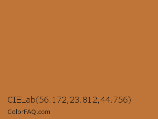 CIELab 56.172,23.812,44.756 Color is a normal orange color and the nearest color is Copper #b87333. Hex code #bf7538 and RGB value is rgb(191,117,56). In RGB color space, this color is composed of 75% red, 46% green, 22% blue, In CMYK color space, this color is composed of 0% cyan, 39% magenta, 71% yellow , 25% black , In HSL color space, this color has a hue angle of 27° , 55% saturation and 48% lightness.