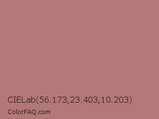 CIELab 56.173,23.403,10.203 Color is a normal red color and the nearest color is Rose Gold #b76e79. Hex code #b37776 and RGB value is rgb(179,119,118). In RGB color space, this color is composed of 70% red, 47% green, 46% blue, In CMYK color space, this color is composed of 0% cyan, 34% magenta, 34% yellow , 30% black , In HSL color space, this color has a hue angle of 1° , 29% saturation and 58% lightness.