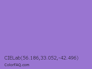CIELab 56.186,33.052,-42.496 Color is a light violet color and the nearest color is Lilac Bush #9874d3. Hex code #9975d1 and RGB value is rgb(153,117,209). In RGB color space, this color is composed of 60% red, 46% green, 82% blue, In CMYK color space, this color is composed of 27% cyan, 44% magenta, 0% yellow , 18% black , In HSL color space, this color has a hue angle of 263° , 50% saturation and 64% lightness.