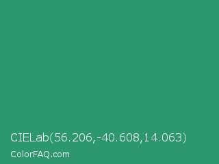 CIELab 56.206,-40.608,14.063 Color is a normal green color and the nearest color is Illuminating Emerald #319177. Hex code #2d986d and RGB value is rgb(45,152,109). In RGB color space, this color is composed of 18% red, 60% green, 43% blue, In CMYK color space, this color is composed of 70% cyan, 0% magenta, 28% yellow , 40% black , In HSL color space, this color has a hue angle of 156° , 54% saturation and 39% lightness.