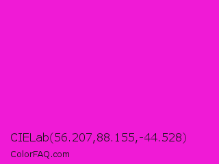 CIELab 56.207,88.155,-44.528 Color is a normal magenta color and the nearest color is Hot Magenta #ff1dce. Hex code #f01ad6 and RGB value is rgb(240,26,214). In RGB color space, this color is composed of 94% red, 10% green, 84% blue, In CMYK color space, this color is composed of 0% cyan, 89% magenta, 11% yellow , 6% black , In HSL color space, this color has a hue angle of 307° , 88% saturation and 52% lightness.