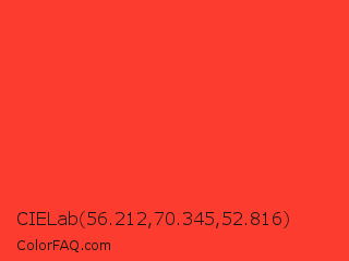 CIELab 56.212,70.345,52.816 Color is a normal red color and the nearest color is Red Orange #ff3f34. Hex code #fc3c2e and RGB value is rgb(252,60,46). In RGB color space, this color is composed of 99% red, 24% green, 18% blue, In CMYK color space, this color is composed of 0% cyan, 76% magenta, 82% yellow , 1% black , In HSL color space, this color has a hue angle of 4° , 97% saturation and 58% lightness.