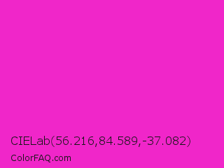 CIELab 56.216,84.589,-37.082 Color is a normal magenta color and the nearest color is Hot Magenta #ff1dce. Hex code #f026c9 and RGB value is rgb(240,38,201). In RGB color space, this color is composed of 94% red, 15% green, 79% blue, In CMYK color space, this color is composed of 0% cyan, 84% magenta, 16% yellow , 6% black , In HSL color space, this color has a hue angle of 312° , 87% saturation and 55% lightness.