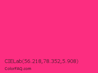 CIELab 56.218,78.352,5.908 Color is a normal rose color and the nearest color is Cerise Pink #ec3b83. Hex code #fc2d80 and RGB value is rgb(252,45,128). In RGB color space, this color is composed of 99% red, 18% green, 50% blue, In CMYK color space, this color is composed of 0% cyan, 82% magenta, 49% yellow , 1% black , In HSL color space, this color has a hue angle of 336° , 97% saturation and 58% lightness.