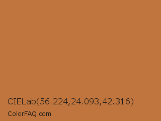 CIELab 56.224,24.093,42.316 Color is a normal orange color and the nearest color is Copper #b87333. Hex code #bf753d and RGB value is rgb(191,117,61). In RGB color space, this color is composed of 75% red, 46% green, 24% blue, In CMYK color space, this color is composed of 0% cyan, 39% magenta, 68% yellow , 25% black , In HSL color space, this color has a hue angle of 26° , 52% saturation and 49% lightness.