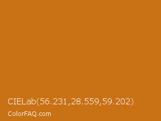 CIELab 56.231,28.559,59.202 Color is a normal orange color and the nearest color is Meteor #d07d12. Hex code #c87115 and RGB value is rgb(200,113,21). In RGB color space, this color is composed of 78% red, 44% green, 8% blue, In CMYK color space, this color is composed of 0% cyan, 44% magenta, 90% yellow , 22% black , In HSL color space, this color has a hue angle of 31° , 81% saturation and 43% lightness.