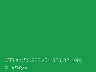 CIELab 56.233,-51.323,32.498 Color is a normal green color and the nearest color is Green Pigment #00a550. Hex code #189b4b and RGB value is rgb(24,155,75). In RGB color space, this color is composed of 9% red, 61% green, 29% blue, In CMYK color space, this color is composed of 85% cyan, 0% magenta, 52% yellow , 39% black , In HSL color space, this color has a hue angle of 143° , 73% saturation and 35% lightness.