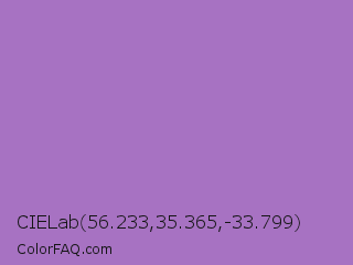 CIELab 56.233,35.365,-33.799 Color is a normal purple color and the nearest color is Rich Lavender #a76bcf. Hex code #a772c2 and RGB value is rgb(167,114,194). In RGB color space, this color is composed of 65% red, 45% green, 76% blue, In CMYK color space, this color is composed of 14% cyan, 41% magenta, 0% yellow , 24% black , In HSL color space, this color has a hue angle of 280° , 40% saturation and 60% lightness.
