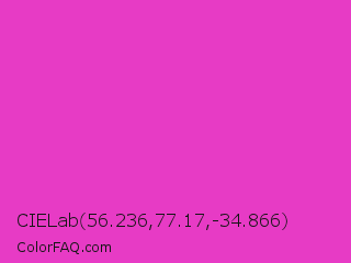 CIELab 56.236,77.17,-34.866 Color is a normal magenta color and the nearest color is Razzle Dazzle Rose #ff33cc. Hex code #e73bc5 and RGB value is rgb(231,59,197). In RGB color space, this color is composed of 91% red, 23% green, 77% blue, In CMYK color space, this color is composed of 0% cyan, 74% magenta, 15% yellow , 9% black , In HSL color space, this color has a hue angle of 312° , 78% saturation and 57% lightness.